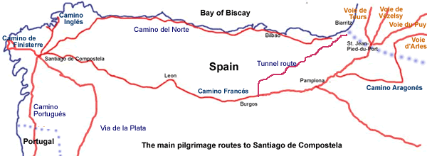 The main route, featured here, is more commonly known as the Camino Frances,. This part of the Camino de Santiago traditionally starts in St Jean Pied de Port and finishes in Santiago de Compostela about 780km later, after traveling the breadth of Northern Spain.(In Santiago you can collect your Compostela) However you can start anywhere and even continue past Santiago to the sea at Finisterre. Finisterre was thought to be the end of the world in medieval times.