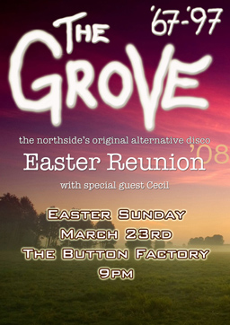 For all those who weren't already aware, the next Grove Reunion will be held on Easter Sunday, 9pm, at The Button Factory (formerly The Temple Bar Music Centre) on Curved St., Temple Bar. Tickets will be going on sale this Wednesday, Feb. 13th and will be available from the following locations: